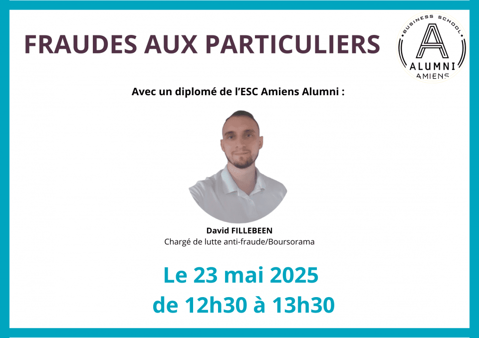 Ne ratez pas le prochain webinaire sur les différentes fraudes aux particuliers avec David FILLEBEEN (PGE 2028), chargé de lutte anti-fraude chez Boursorama.