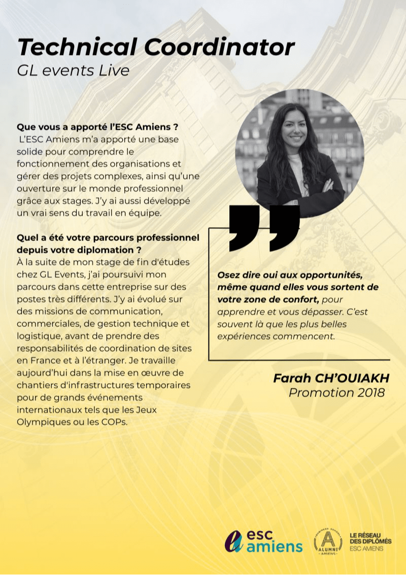 Voici donc le tour de Farah CH'OUIAKH, diplômée Bachelor 20188 et Mster ISEG 2020. Joli parcours depuis la sortie de l'école chez l'un des plus gros acteur mondial de l'événementiel présent dans plus de 20 pays, GL Events, où Farah, forte de son expérience de chargée d'affaires salon, a été responsable adjointe opérations pour les Jeux Olympiques et Paralympiques de Paris en 2024 et dernièrement Technical Coordinator pour les Jeux Olympiques d'Hiver de Milan.